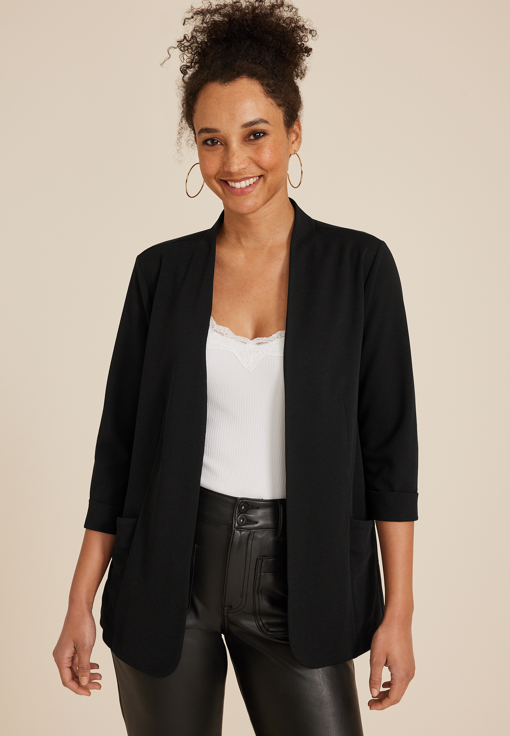 The blazer straddles the smart-casual line. Whether you're working from home or heading to an important meeting, you can find a blazer to suit the occassion at maurices. Try a duster blazer with a striped long-sleeve tee for a cozy work-from-home ensemble. Or, dress to impress in a twill or boyfriend blazer with smart pants and high heels.